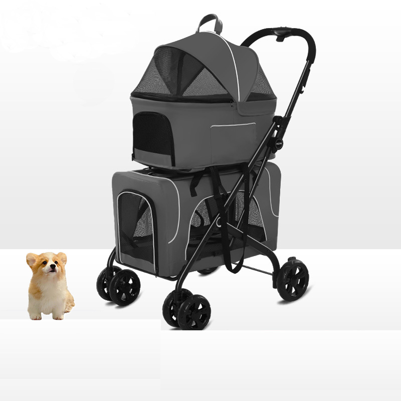 23.23x20.1x11.02inch2 Detachable Cat Carrier No-Zip Double Pet Travel Stroller, featuring a spacious two-tier design for multiple pets. Easily foldable with one click, it offers portability and ample storage. Upgraded shock-absorbing wheels ensure smooth rides, while cozy cushions, secure belts, and breathable mesh keep pets safe and comfortable on every journey.