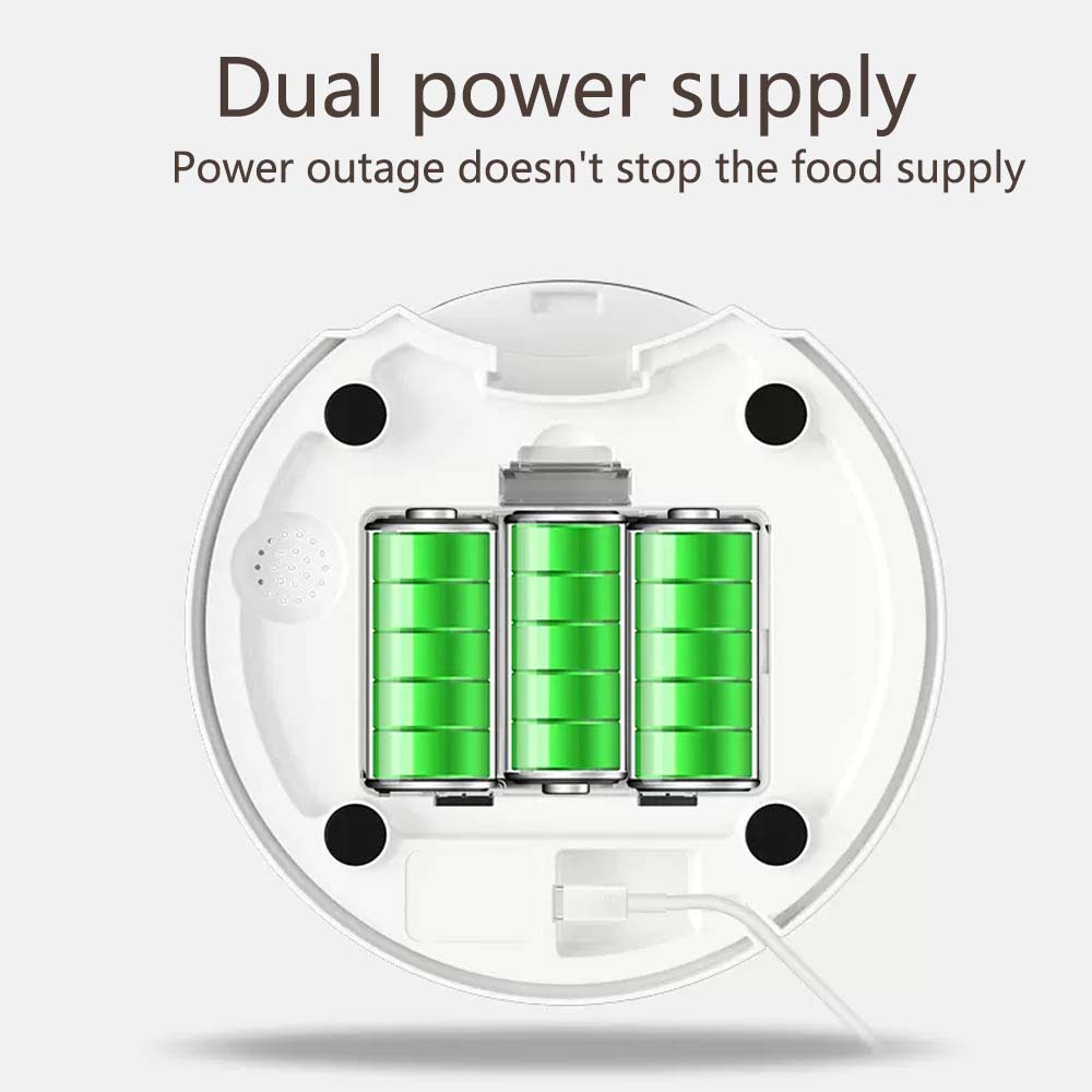 Dual power (USB adapter or 3 D-cell batteries) keeps feeding on track during outages.